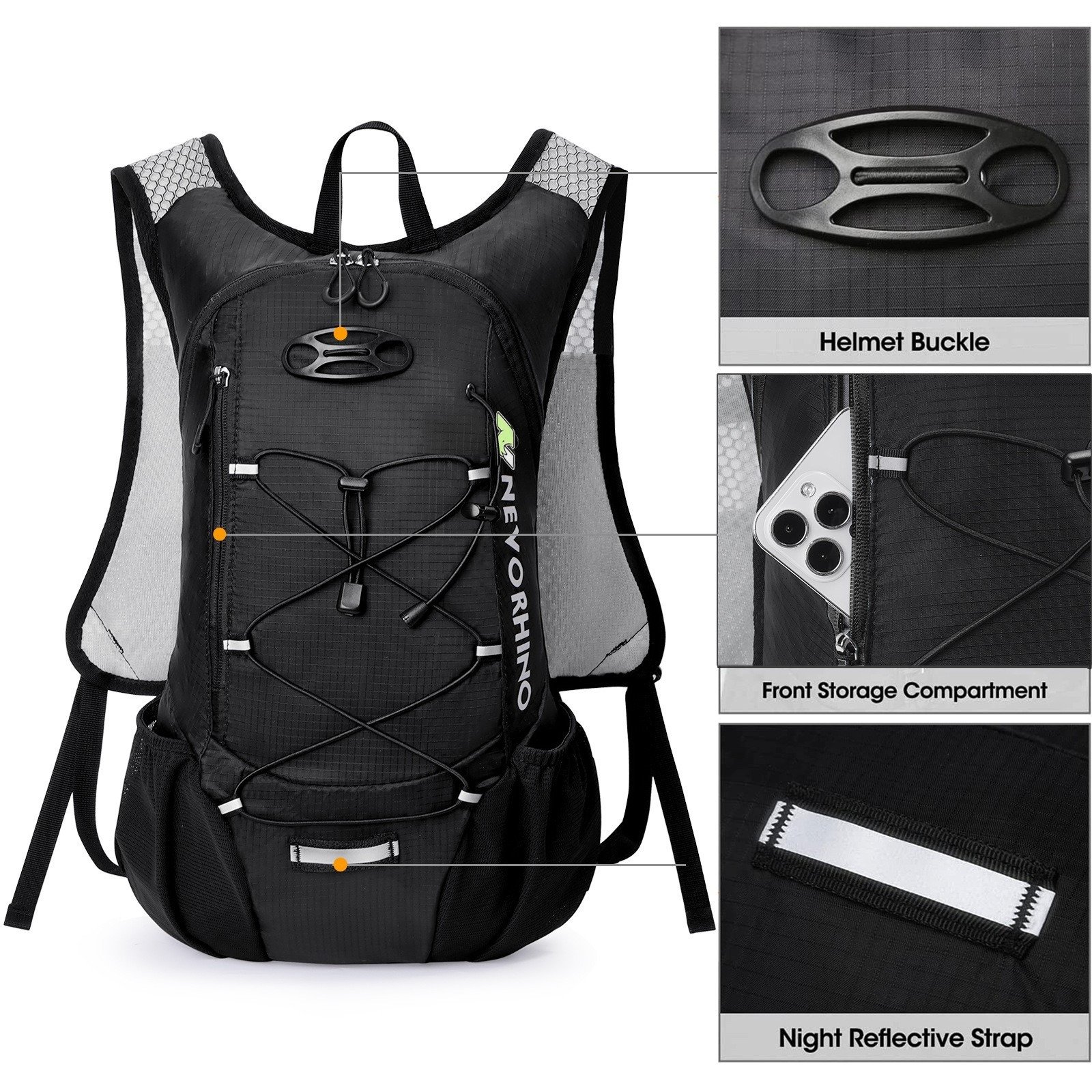 Helmet specific buckle, side pockets on the left and right, for storing personal belongings.